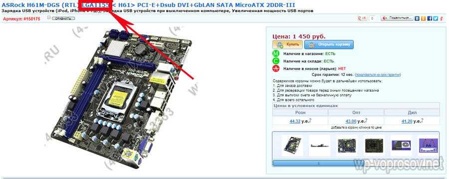 На данном скриншоте отображена плата с сокетом 1155, о чем явно говорит название: «ASRock H61M-DGS (RTL) LGA1155 PCI-E+Dsub DVI+GbLAN SATA MicroATX 2DDR-III»