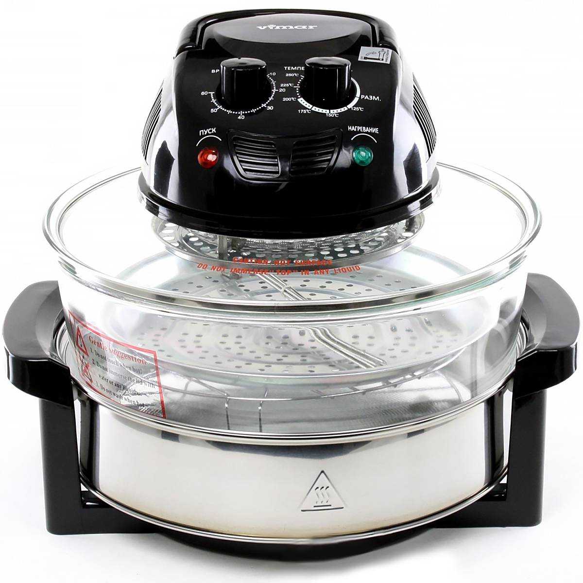 Этот устройство состоит из круглой стеклянной ёмкости, которая располагается на пластиковой подставке. Ёмкость закрывается крышкой, в которую встроен ТЭН и вентилятор. Снаружи прибора обязательно находится панель управления. В недорогих моделях вместо ТЭНа устанавливаются галогеновые нагревающие элементы. Главное преимущество этих элементов в том, что в процессе эксплуатации стеклянная ёмкость не окисляется.