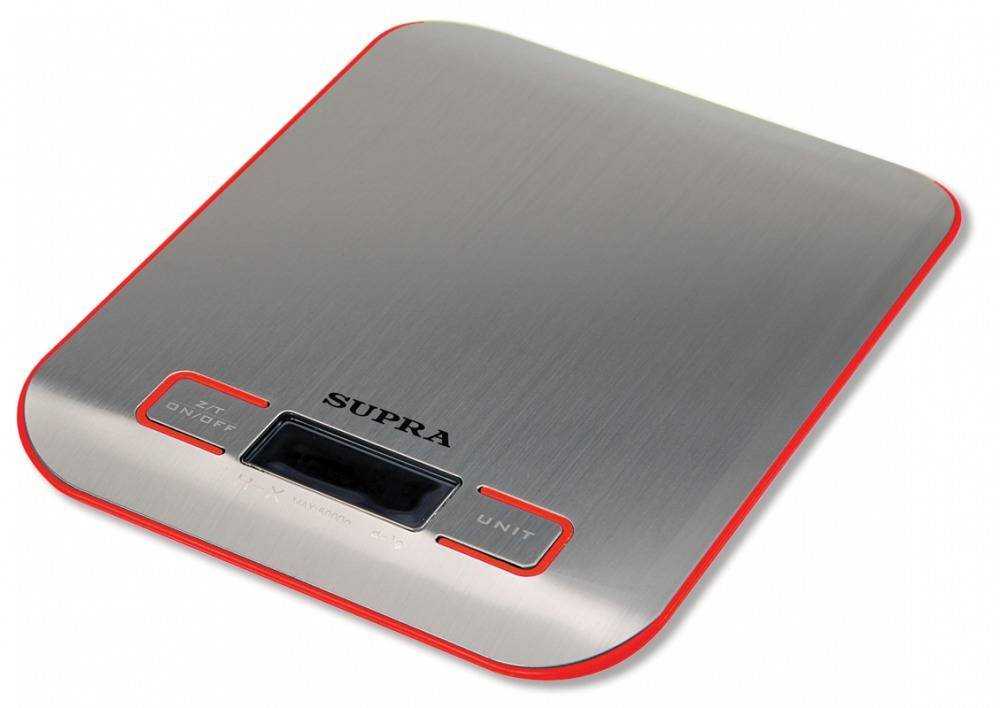- Supra. Имеет обширную модельную линейку кухонных весов. Наиболее востребованными являются электронные приборы с металлической чашей или с пластиковым кувшином. Их предел соответствует двум килограммам. Есть функция сброса тары, суммирования результатов, перевода единиц измерения, автоматического отключения.