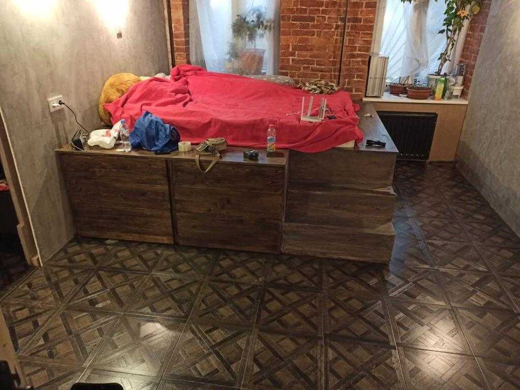 • Если пол имеет слишком большие перепады, листовой материал стелется в два ряда. Для выравнивания пола под листы напольного материала подкладываются бруски и кусочки фанеры или ДСП.