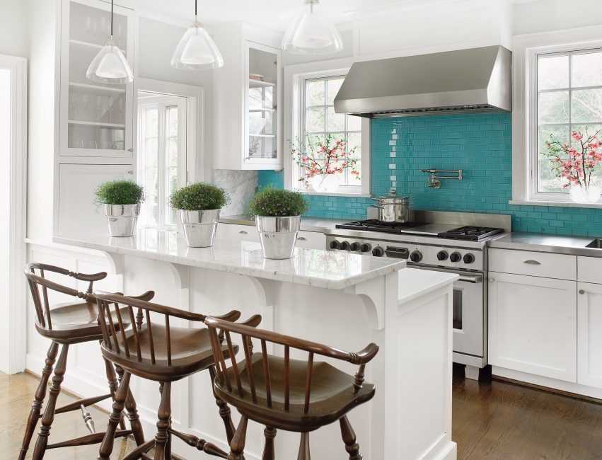 - синий – дарит ощущение свежести, спокойствия, возможно разбавить им белую, голубую, красную, желтую кухню;