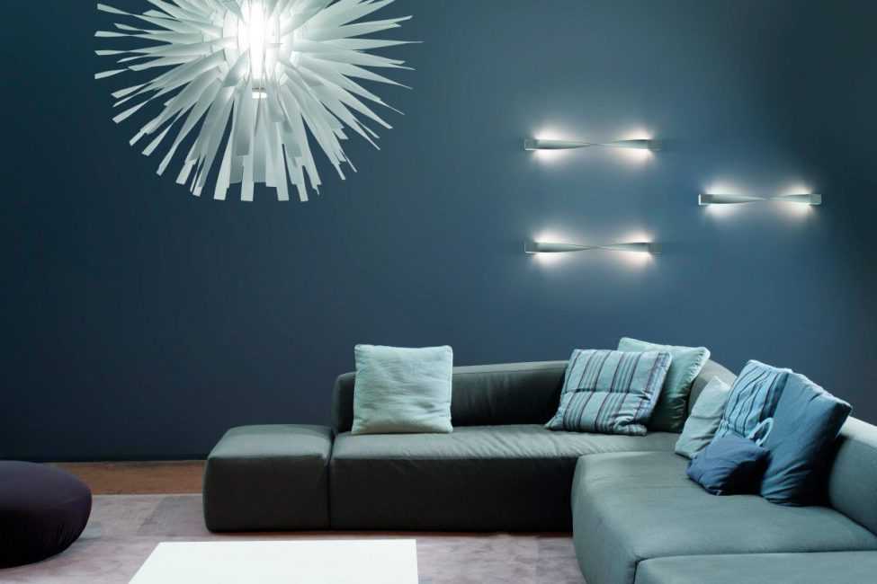 Если рожки направлен на стены, гостиная расширяется, такой приём используют в небольших комнатах. Освещение сильнее и равномернее.