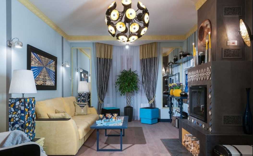 Если гостиная обладает небольшой площадью, то здесь устанавливаются светильники одной модели и размера, но разных цветов. Хорошим вариантом станет использовать контрастные оттенки. Прием используется только в подходящих стилях.