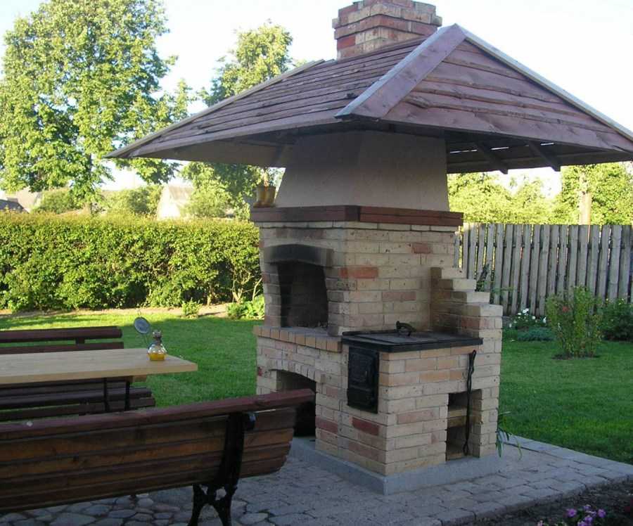Для изготовления такого мангала используется жаропрочный кирпич. Чтобы ускорить время приготовления шашлыка, на дно конструкции требуется положить толстый лист металла. Кроме того, мангал имеет дымоход и навес, что позволяет готовить на нём в течение всего года.