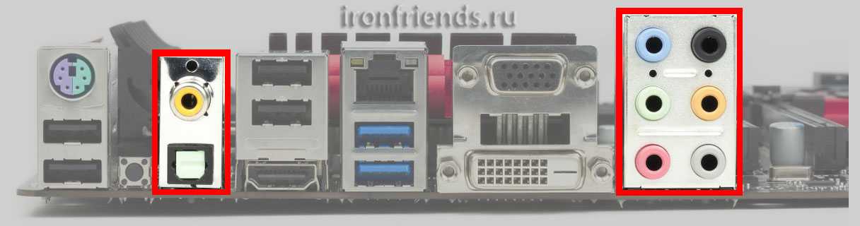Материнские платы обычно имеют 3, 5 или 6 гнезд 3.5 мм для подключения аудиоустройств. Также может присутствовать оптический и иногда коаксиальный цифровой аудио выход.