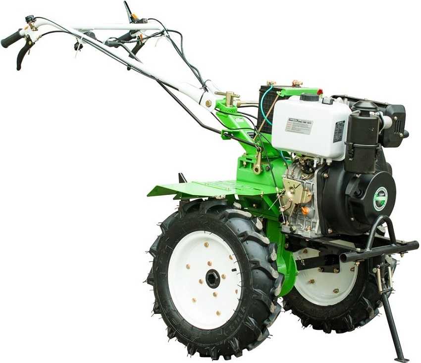 Мощный дизельный мотоблок для любых мыслимых условий. Аппарат тяжелого класса – способен работать как тягачом, так и мини-трактором с любыми насадками, запитываемыми через вал отбора мощности. Имеет усиленную сцепку, на которую можно крепить плуг, культиватор, прицеп и любое другое тяжелое оборудование. Мощность – 6 л. с., что сравнимо уже не с мотоблоками, а с мини-тракторами. Очень хорошая система пуска, прочный редуктор, удобные и эргономичные рукоятки.