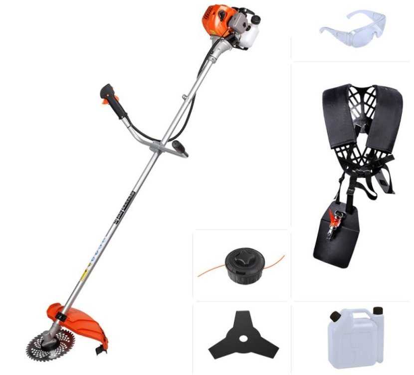 Бак для топлива рассчитан на 0,95 л. Весит около 8 кг. Удобная рукоятка позволяет держаться за нее обеими руками, что упрощает процесс работы. Косилка разбирается, затем компактно укомплектовывается.
