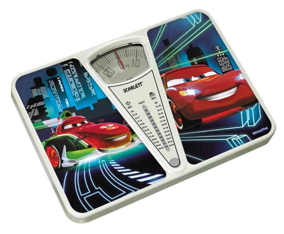 Scarlett SC-BSD33M952 отлично подойдет для детей благодаря своему красочному дизайну из мультфильма. На передней панели располагается шкала роста, которая отлично подойдет и мальчикам, и девочкам. Корпус прочный и выдерживает нагрузки до 130 килограмм. Стойкость устройства на гладкой поверхности обеспечивают четыре резиновые ножки.
