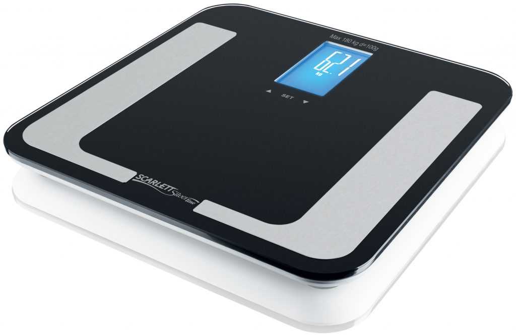 Рейтинг напольных диагностических весов в бюджетном сегменте открывает модель от Scarlet. Это не просто весы, а настоящий помощник в похудении. Прибор сохраняет данные о поле, возрасте и росте 8 пользователей, измеряет уровень воды в организме, процент мышечной, костной и жировой тканей, рассчитывает норму калорий. Показывает изменения относительно последнего взвешивания при нажатии сенсорной кнопки.