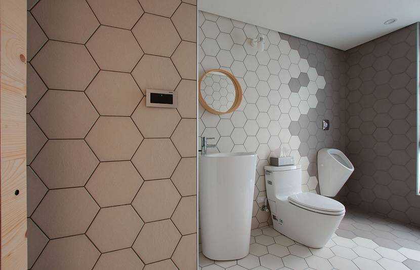 Крупная шестиугольная плитка немного напоминает оформление помещений в старину. Таким кафелем выкладывались не только стены, но и пол. В приоритете бежевый, белый и серый оттенок для данной формы кафеля. Если желаете соответствовать моде, то таким материалом нужно создавать различные орнаменты на стенах.