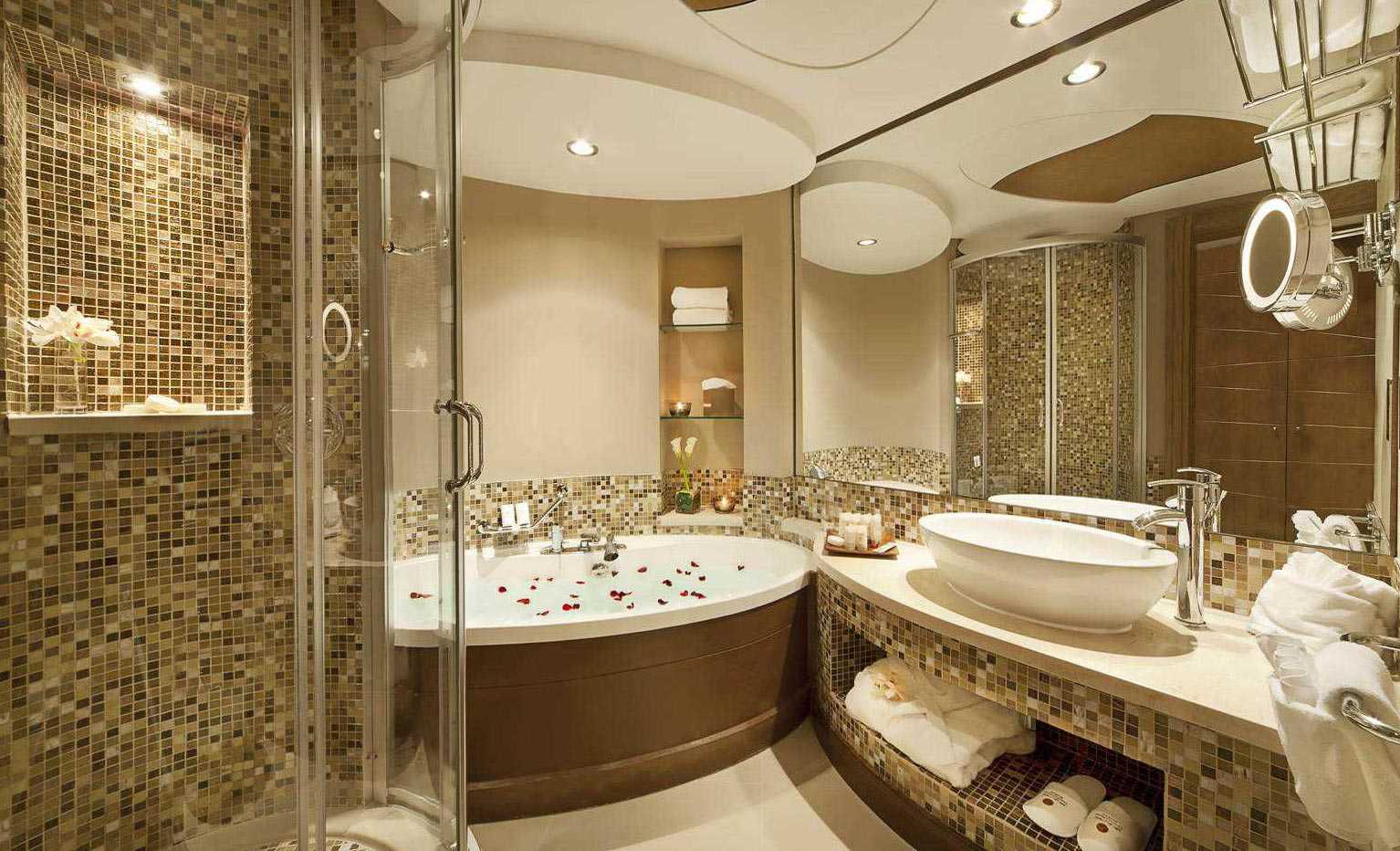 Можно сказать, что число дизайнерских решений по отделке ванных комнат намного превышает число дизайнеров, поскольку большинство вариантов принимают сами владельцы жилья, учитывая рекомендации опытных мастеров. Поэтому в статье будет приведено только несколько лучших видов применения напольной и настенной плитки из разных ценовых категорий. В этих дизайнах комплект состоит не только из самих плит, но также включает бордюр, панно и мозаики.