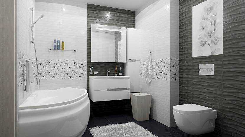 Отличное контрастное оформление стен рельефным кафелем. С помощью такого подхода удается зонировать комнату на два и более участков. В моде белый и серый тон с глянцевым покрытием. Что касается напольного покрытия, то здесь уместно использовать ребристый кафель с темно-синим отливом.