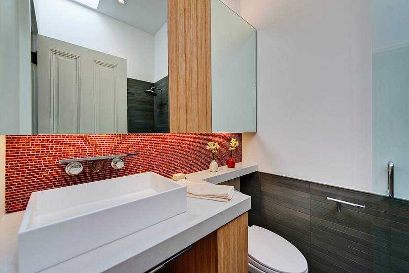 Если приходится облагораживать совмещенный санузел, то в моде будет мозаика красно-оранжевого цвета. Такой стиль обычно используется для декорации некоторых функциональных зон: ванны, душа, умывальника, туалета. В остальном коричневый кафель в полстены и верхняя облицовка пластиковыми панелями — идеальный вариант.