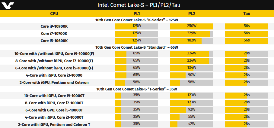В таблице указано типичное энергопотребление при работе процессоров на базовой частоте (PL1) и в турбо бусте при максимальной частоте по всем ядрам (PL2). Параметр «Tau» указывает сколько времени процессор может непрерывно работать при максимальном энергопотреблении, после чего частоты могут начать снижаться.