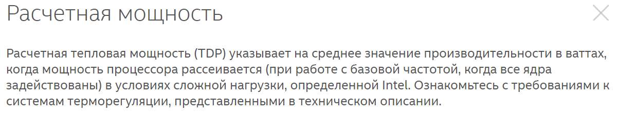 Этот параметр определяет уровень тепловыделения процессора и необходим для правильного подбора кулера. Однако, стоит учитывать, что указывается среднее значение при работе на базовой частоте.