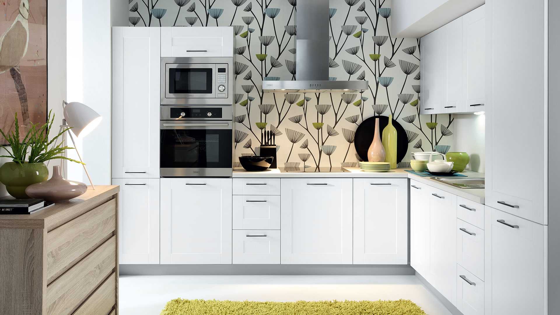 Обдуманно подбирая фактуру, оттенок и расцветку рулонов для отделки белых стен, легко создать требуемую атмосферу и зрительно изменить формат кухни.