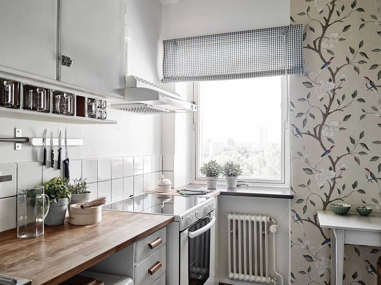 Внимание! Сочетание светлой мебели и обоев позволит зрительно освободить пространство в тесной кухне.