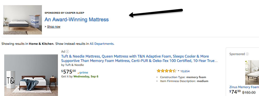 Headline Search Ads отображаются на страницах результатов поиска, эти баннеры всегда выше списка результатов, как на примере ниже. Это объявления с ценой за клик (CPC) и ведут с поисковых запросов на любую указанную вами страницу на Amazon.