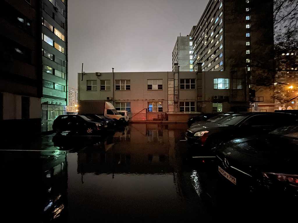 Фото на ширик немного приближает к реальности: в переулке темно. Однако, смартфон захватил свет как от пфонаря справа, стоящего вдалеке, так и от освещённой улицы слева. В итоге получилось сочное фото, на котором можно даже различить номерные знаки у машин. Надо ли говорить, что в реальности ничего этого не было видно невооружённым глазом?