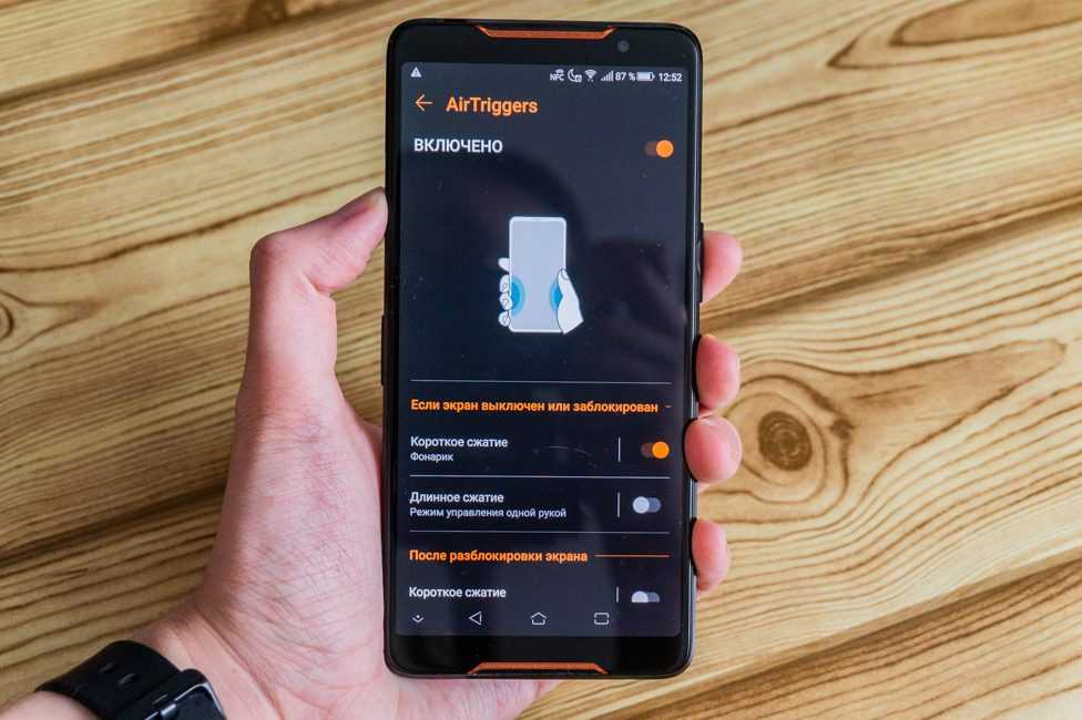 Если смартфон разблокирован, опций на сжатия уже на порядке больше, например, имитация действий клавиш. При первичной настройке (или после) предлагается настроить уровень усилия при сжатии и нажатии на чувствительные области.