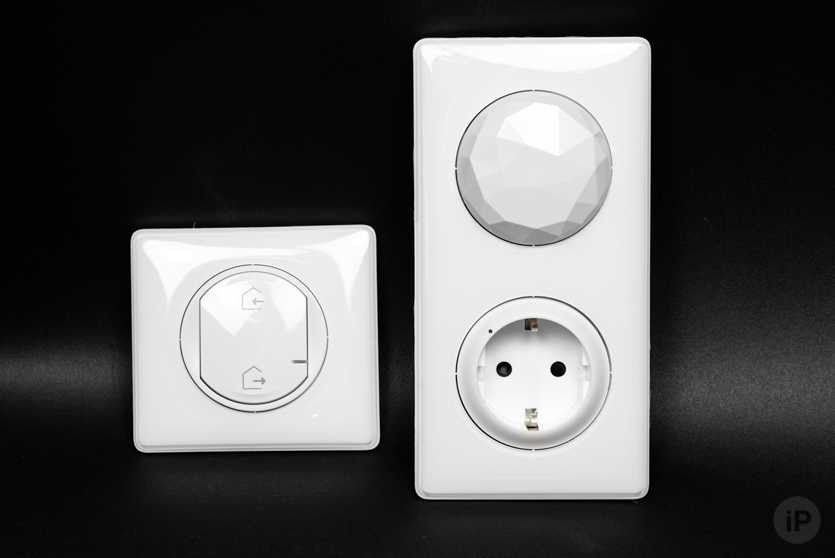 Для работы нужен центр управления: шлюз, умная розетка и главный выключатель «Я дома / Я вне дома». Все это входит в стартовый набор. Устройство подключается к одинарной монтажной коробке, потому что его верхняя часть с «гранёным шаром» со стороны стены плоская.