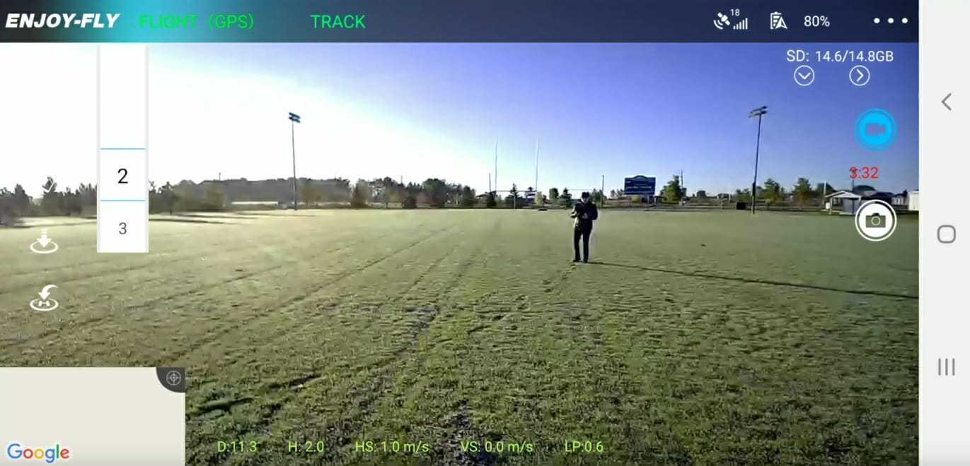 Дрон не поддерживает SD-карты, поэтому вся информация сохраняется на подключенном смартфоне. Максимальная дальность работы пульта управления до 50 метров, далее наблюдается потеря уверенного сигнала. Время полета составялет 20 минут, а заряжается полностью всего за 60 минут.
