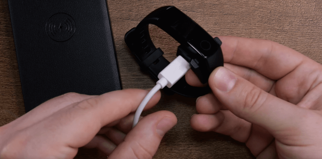 Заряжать браслет удобно, так как не нужно вынимать капсулу из браслета, зарядный кредл просто фиксируется на задней части трекера. Полная зарядка устройства займет примерно 90 минут.
