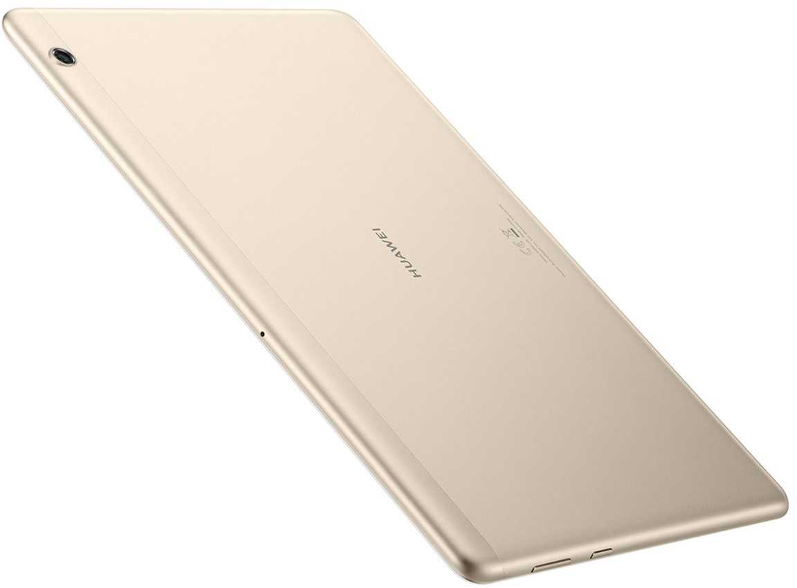 Открывает наш рейтинг планшет MediaPad T5 10. У него интересный элегантный дизайн. Есть тонкий прочный металлического корпус с закругленными краями. Цвет – черный или золотой. Планшет удобно держать в руках и носить с собой. Весит устройство всего 460 грамм, при размерах 164х243х7,8 мм.