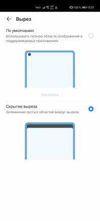 «Другие настройки экрана» включают в себя параметры отображения имени оператора и скорости сети. Возможно убрать вырез на экране путём отключения пикселей идущих на одном уровне с фронтальными камерами. Можно также настроить полноэкранное отображение приложений, чтобы они включали в себя эту область, где расположена камера.