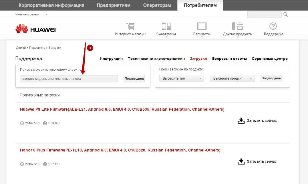 Для поиска нужной прошивки введите правильное название модели на английском языке, например, Honor 5X, либо служебный номер модели, например, KIW-L21.