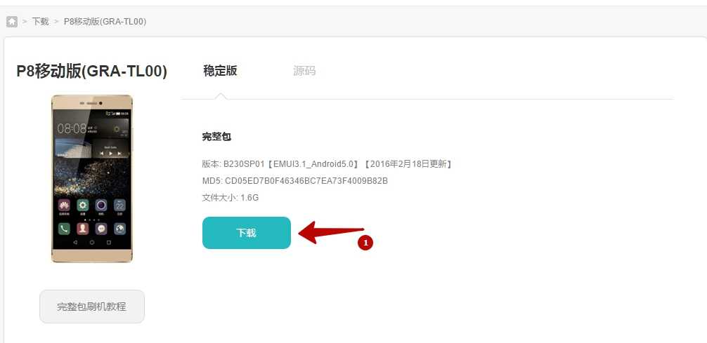 После выбора нужной модели в списке на портале прошивок emui.huawei.com вы попадете в карточку модели, где представлена самая последняя версия прошивки. Для ее скачивания нажмите на бирюзовую кнопку с иероглифом.