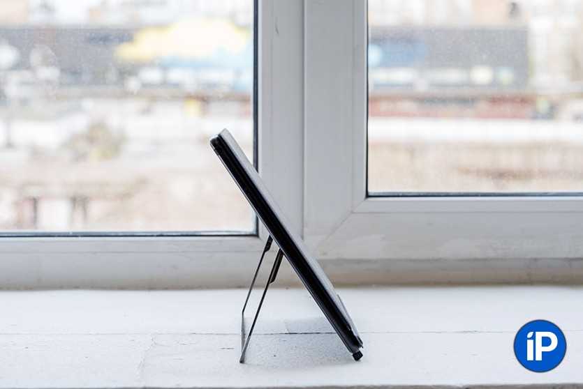 Нужно легонько, аккуратно коснуться стола нижней частью планшета — и спрятанная рамка выскочит, обеспечивая планшету устойчивое положение под 120 градусов.