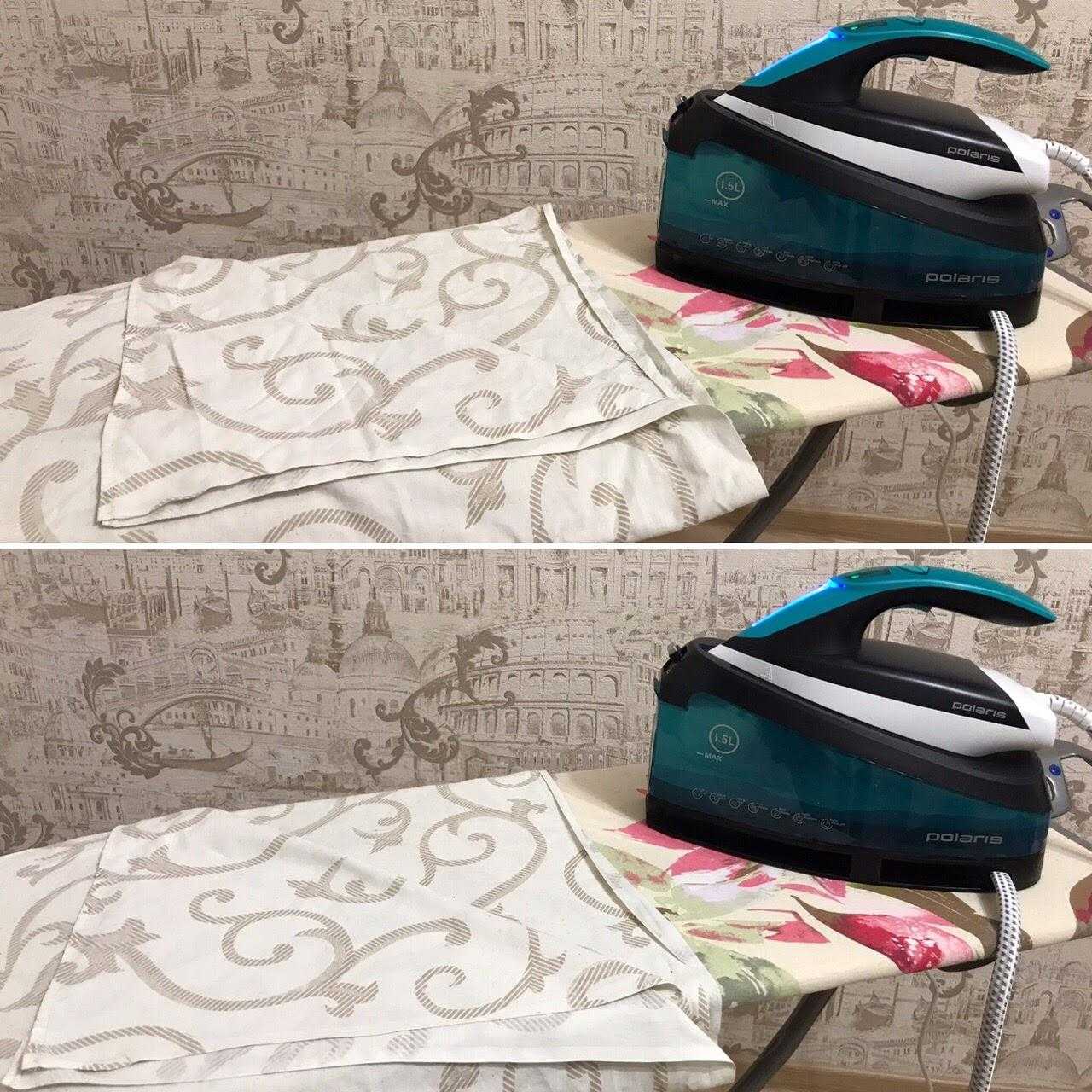 Пользоваться им в этом случае оказалось действительно эффективно: мощный паровой удар позволяет легко и быстро прогладить ткань даже на весу. На этот раз нам понадобилось больше времени, чтобы прогладить изделие: на две шторы у нас ушло 25 минут.