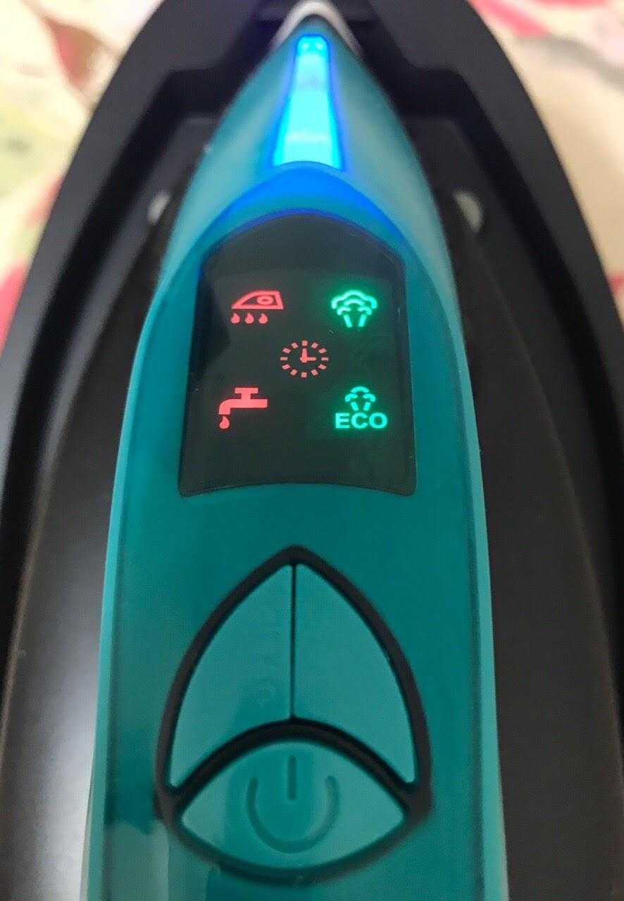 С левой стороны – индикатор функции самоочистки и ниже индикатор нехватки воды. Это удобная функция, потому что если вы забудете перед работой долить воду в прибор, он вам об этом обязательно напомнит — и даже не станет работать. В центре дисплея находится индикатор автоотключения, который загорится в том случае, если вы забудете выключить утюг после глажения – через 10 минут после ожидания. С правой стороны находятся индикаторы интенсивной подачи пара (до 120 г/мин) и ниже ECO режима (до 60 г/мин). Кнопкой справа можно переключаться между режимами – ECO поможет вам сэкономить электроэнергию и воду за счет уменьшения количества пара.