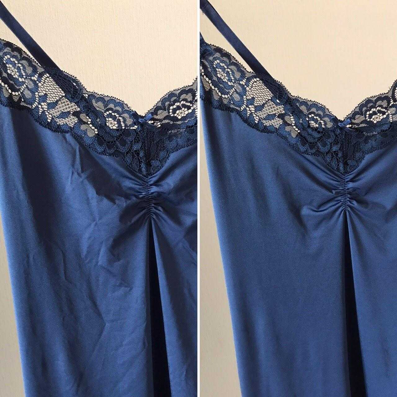 В случае с домашним платьем проблема была в том, что изделия из вискозы требуют особенно бережного ухода – и гладить их нужно при минимальном температурном режиме. Это изделие мы гладили сразу после рубашки: по обещанию производителя, нам не нужно ждать, пока утюг остынет, ведь технология Smart Temp автоматически позаботится о подходящем температурном режиме. Кроме того, на нашем домашнем платье есть кружевные вставки. На ткани имеются сильные заломы после стирки и хранения в сложенном виде. Посмотрим, как справится с ними парогенератор POLARIS в режиме ECO.