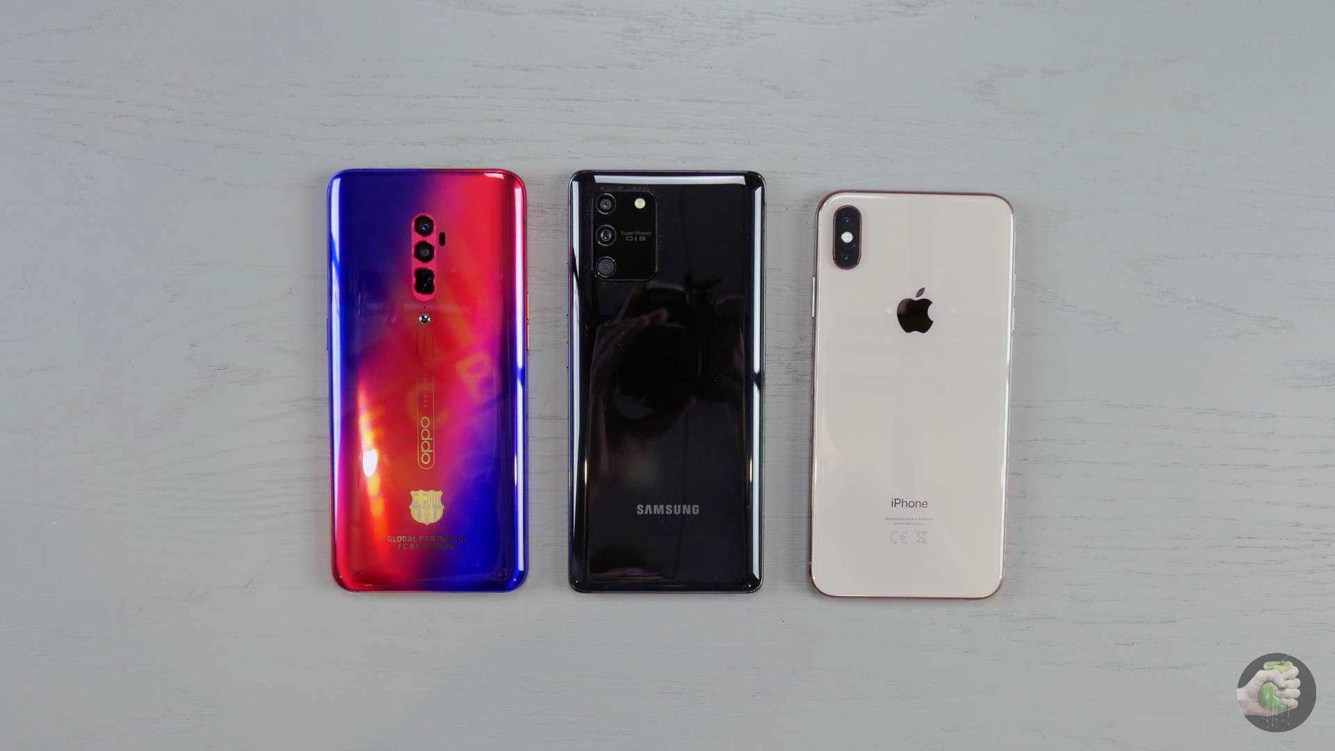 Сравнение размеров OPPO Reno 10x Zoom FC Barcelona Edition, Samsung Galaxy S10 Lite и iPhone XS Max. Фото: Илья Кичаев / Wylsacom Media