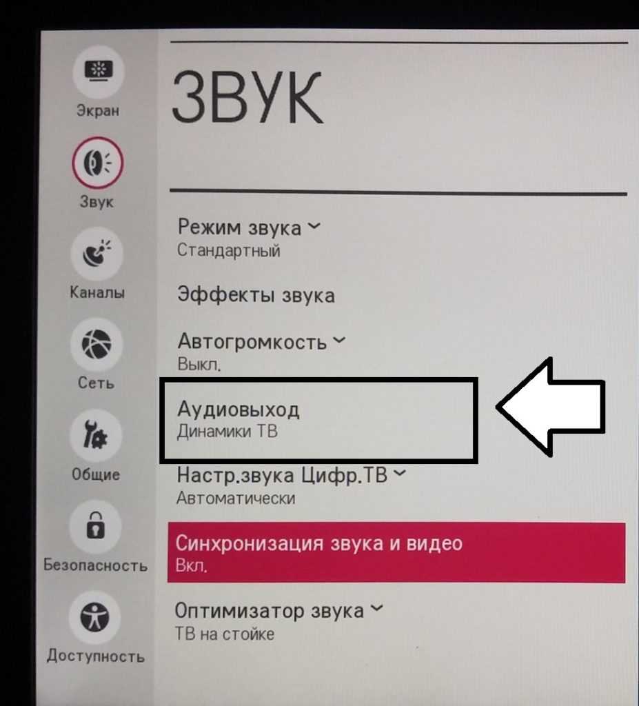 Для начала. Если это операция вам не помогла, то необходимо опять зайти в настройки звука и посмотреть источник звука. Если у вас не подключен sound-бар или внешние динамики, то значение в поле «Аудиовыход» должно стоять «Динамики ТВ»