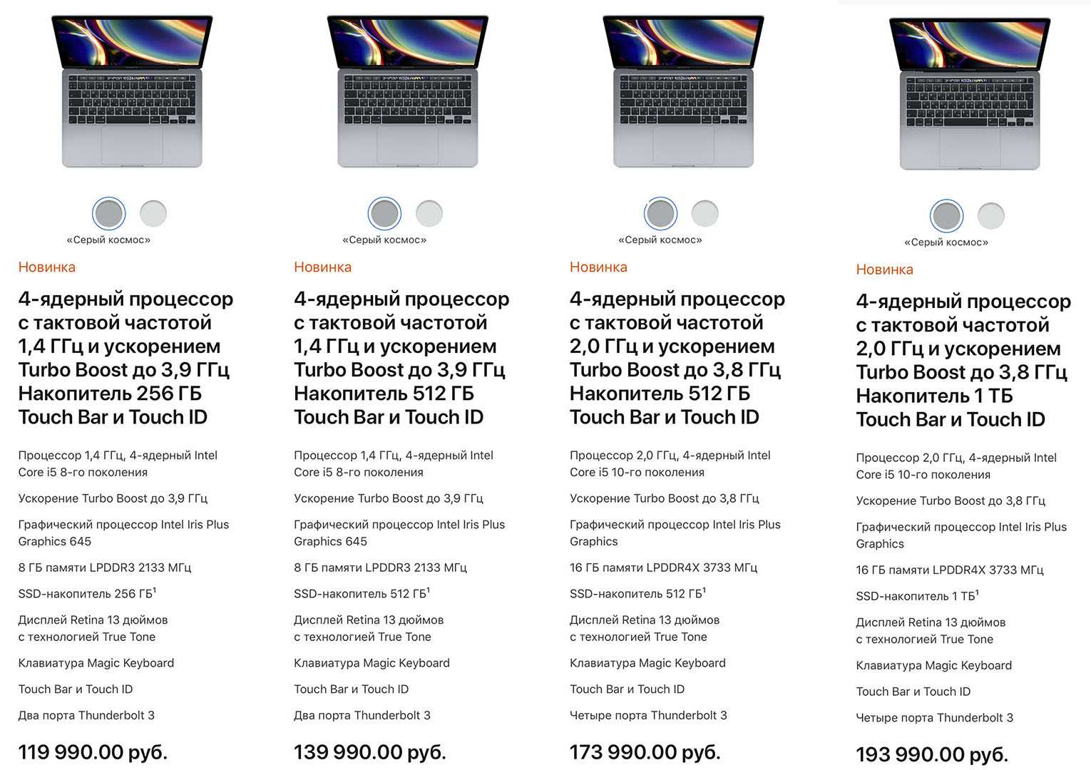 Начальные версии MacBook Pro 13 стоят 119 990 и 139 990 рублей соответственно, вся разница в объёме встроенной памяти: 256 или 512 ГБ. Если нужен новый процессор Intel десятого, а не восьмого поколения, и быстрая оперативка как в Air, тогда придётся раскошелиться на покупку дорогих модификаций. Напомню, что в качестве приятного бонуса вместе с топовыми версиями MacBook Pro 13 получаем не два, а четыре порта Thunderbolt 3. За 173 990 рублей можно купить ноутбук с 16 ГБ оперативки, 512 ГБ собственной памяти и 4-ядерным Intel Core i5. Следующий вариант — это модель за 193 990 рублей в такой же конфигурации, но с SSD на 1 ТБ.