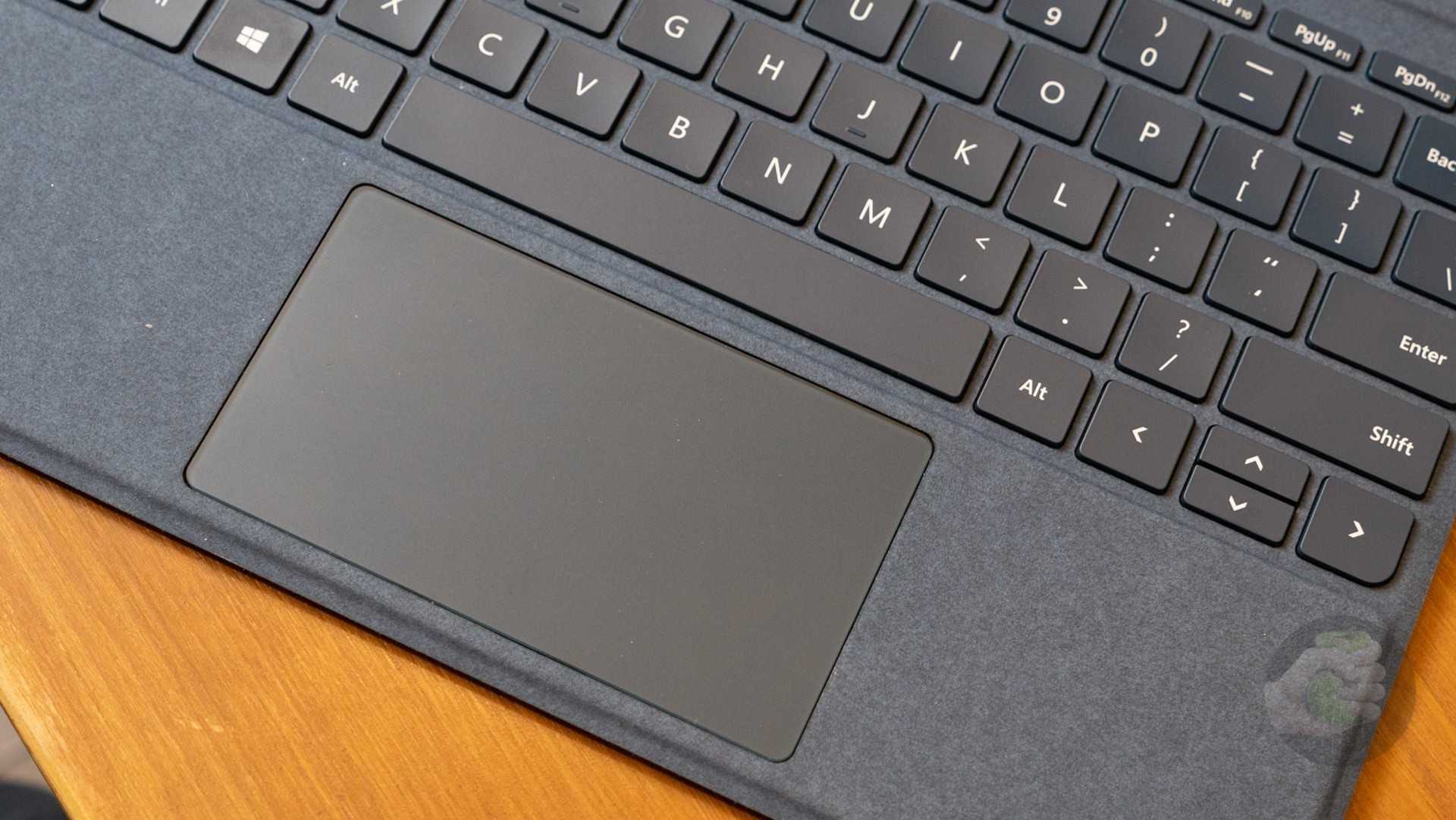 Тут же под клавиатурой размещен довольно крупный, по меркам этой категории устройств, трекпад. Конечно, ноутбучные варианты побольше и заметно комфортнее в работе, но для Surface Go существующего оказалось совершенно достаточно. Тем более, можно тапать и скролить по сенсорному экрану, а наводиться на мелкие элементы или выделять текст с трекпада. В общем, он вполне годится для работы.