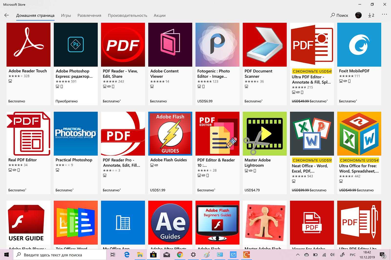 Вы можете зайти в этот магазин и набрать в поиске «Adobe». И он вам выдаст 269 разных приложений, где хоть как-то упоминается это слово. Разработаных самой компанией Adobe только пять из них. И это, конечно же, не полноценный фотошоп.