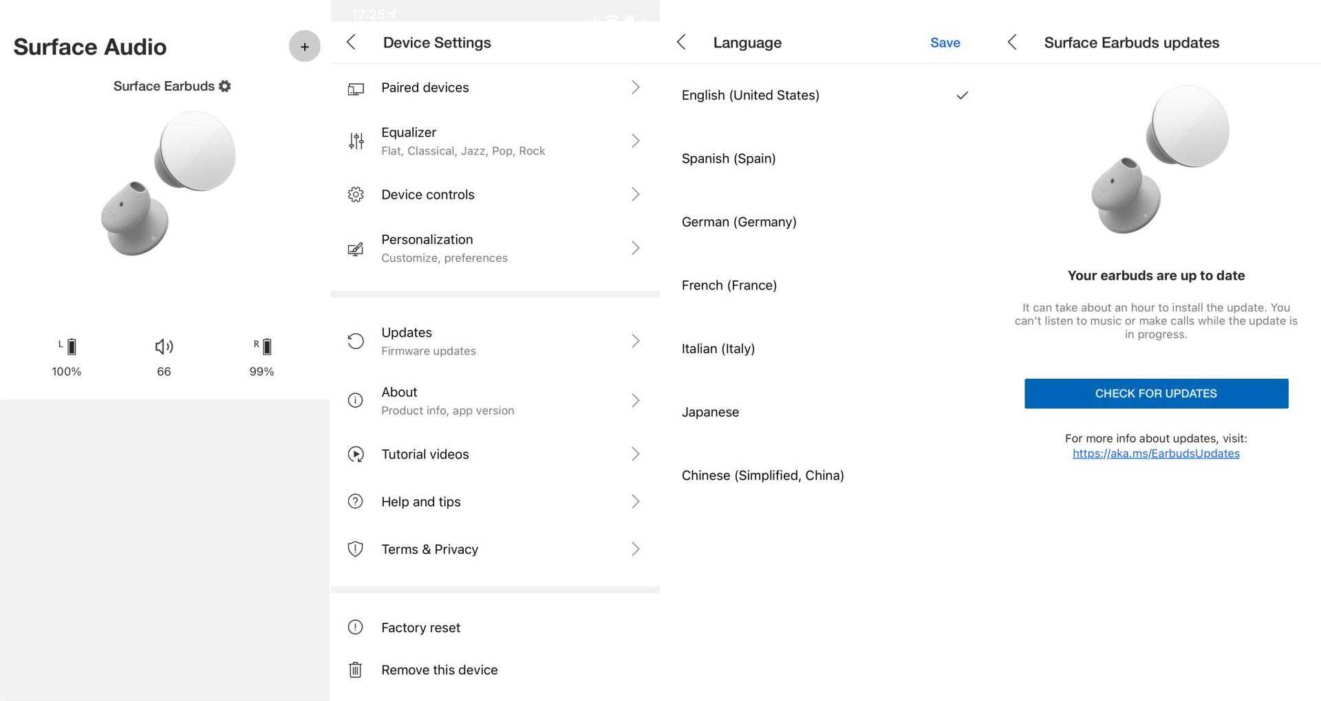 У наушников есть приложение Surface Audio. В нём вы можете управлять своими наушниками Microsoft, смотреть заряд аккумуляторов (не кейса), а также обновлять наушники и менять настройки эквалайзера: