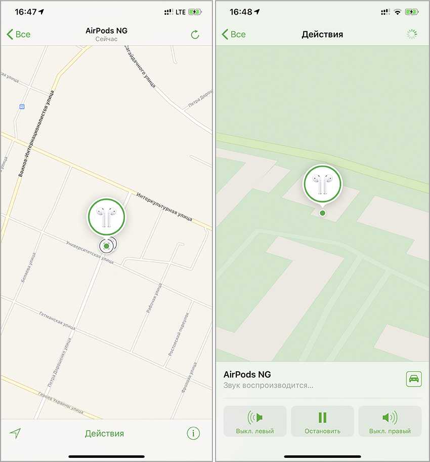На помощь каждый раз приходило приложение «Найти iPhone». Немногие знают, но оно не только отображает последнее местоположение наушников, которое определяется по коннекту с iPhone, но и дает возможность воспроизвести звук на них.