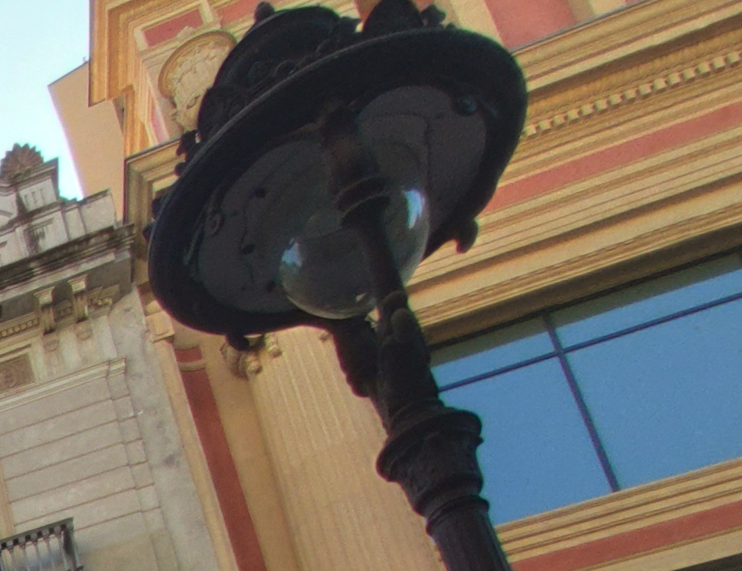 А вот на кропе фактура стен выглядит уже не так круто. Да и рамки нижнего фонаря не видно: всё слилось, а матрица просто не увидела информацию о ней. Но на кадре, сделанном на основной модуль, их видно.