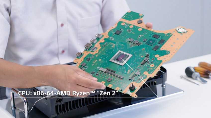 В основе лежит APU — единый блок, в котором совмещены центральный процессор и видеокарта. По части CPU PS5 одинакова с Xbox: это два чипа Zen 2 по четыре ядра в каждом, что в сумме даёт восемь ядер с поддержкой 16 потоков. Отличается лишь подход к частотам и режимам работы.
