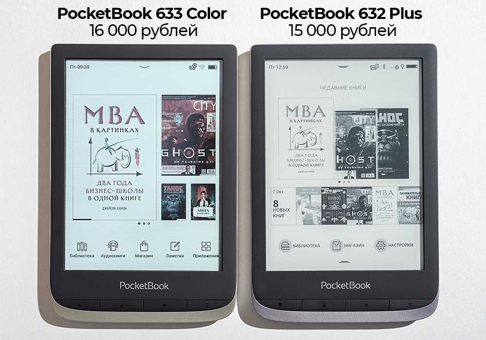 ● У PocketBook Color 633 в два раза больше оперативной памяти, 1 Гб против 512 Мб у PocketBook 632 Plus.