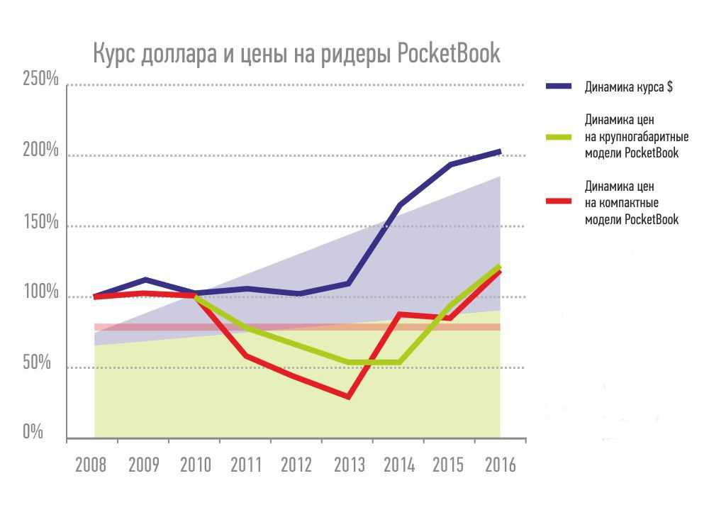 Стоит особо подчеркнуть, что рублевые цены на модели PocketBook с момента выхода компании на рынок росли заметно медленнее курса доллара. Нижеследующий график отражает тот факт, что в PocketBook прекрасно осознают невозможность привязки цен к курсу доллара, поскольку это сделает ридеры куда менее доступными для населения. (Под крупноформатными следует понимать модели с диагональю 8 и 9,7 дюйма, под компактными – 5 и 6 дюймов).