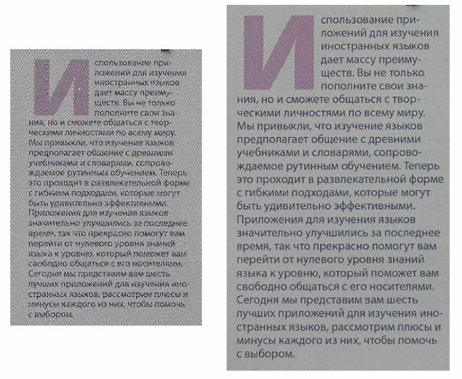 Слева – фрагмент текста PDF-журнала, страница полностью помещается на экране. Справа – тот же фрагмент при увеличении примерно на 150%. Как видим, из россыпи пикселей получается вполне четкий текст.