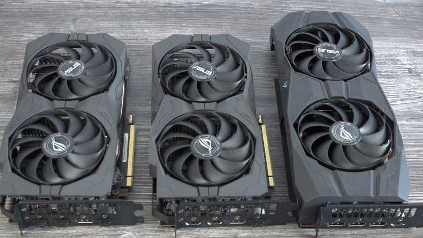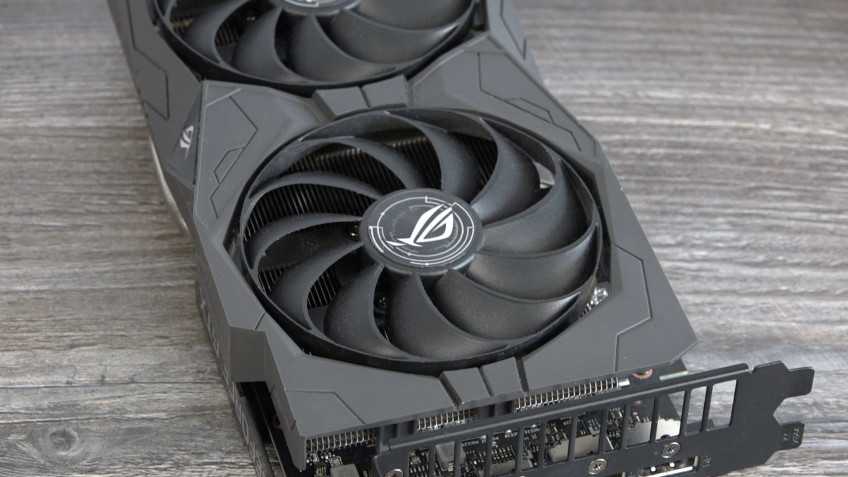 Теперь давайте про ASUS и наши версии. ROG Strix — это топовая линейка компании, что видно по самим картам. Начну с GeForce, так как они вообще неотличимы друг от друга. Выглядят карты очень дорого, хотя они и в реальности дорогие. Сзади стоит алюминиевая пластина жесткости. Спереди — два DisplayPort и два HDMI, за что, кстати, отдельное спасибо. Ну и сверху — пластиковый кожух с двумя вентиляторами.