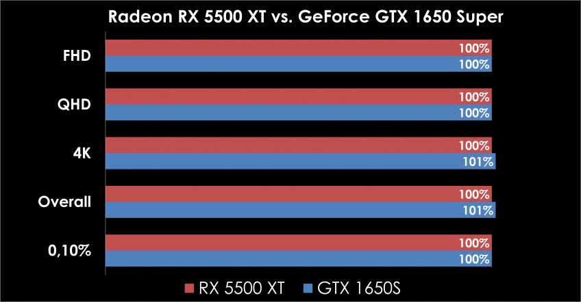 Теперь о производительности. Начну с младших RX 5500 XT и GTX 1650S. Лично у меня были большие надежды на 8 ГБ памяти у Radeon, но по тестам карты абсолютно одинаковые. Да, иногда вперед вырывается GeForce, иногда Radeon, но совокупно средняя разница у них 0%, причём по всем разрешениям и даже по 0,1%.