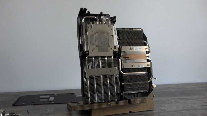 На Radeon система гораздо серьезнее. Во-первых, карта сама по себе длиннее на 3,7 см и толще на 0,7 см. Во-вторых, радиатор двойной и на пяти трубках. В-третьих, у него есть приливы и отдельная пластина для контакта с VRM. В-четвертых, на процессор он опирается нормально отполированным основанием и накрывает все чипы памяти.